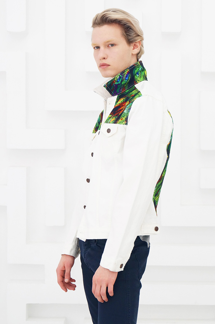 Джинсовая куртка от модного дома LIGVIANNI.  Куртка создана в коллаборации с дизайнерами братьями Сергеевыми Игорем, Георгием, Павлом из плотного хлопкового денима. Особый интерес представляет оригинальный высокохудожественный авторский принт который легко возьмет на себя роль главного цветового акцента в любом месте. Модель с отложным воротником и длинными рукавами. Изделие дополнено застежкой на пуговицы. На груди - накладные карманы с клапанами.